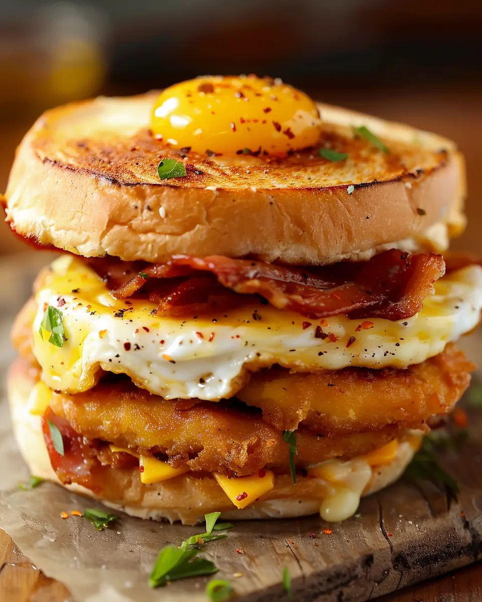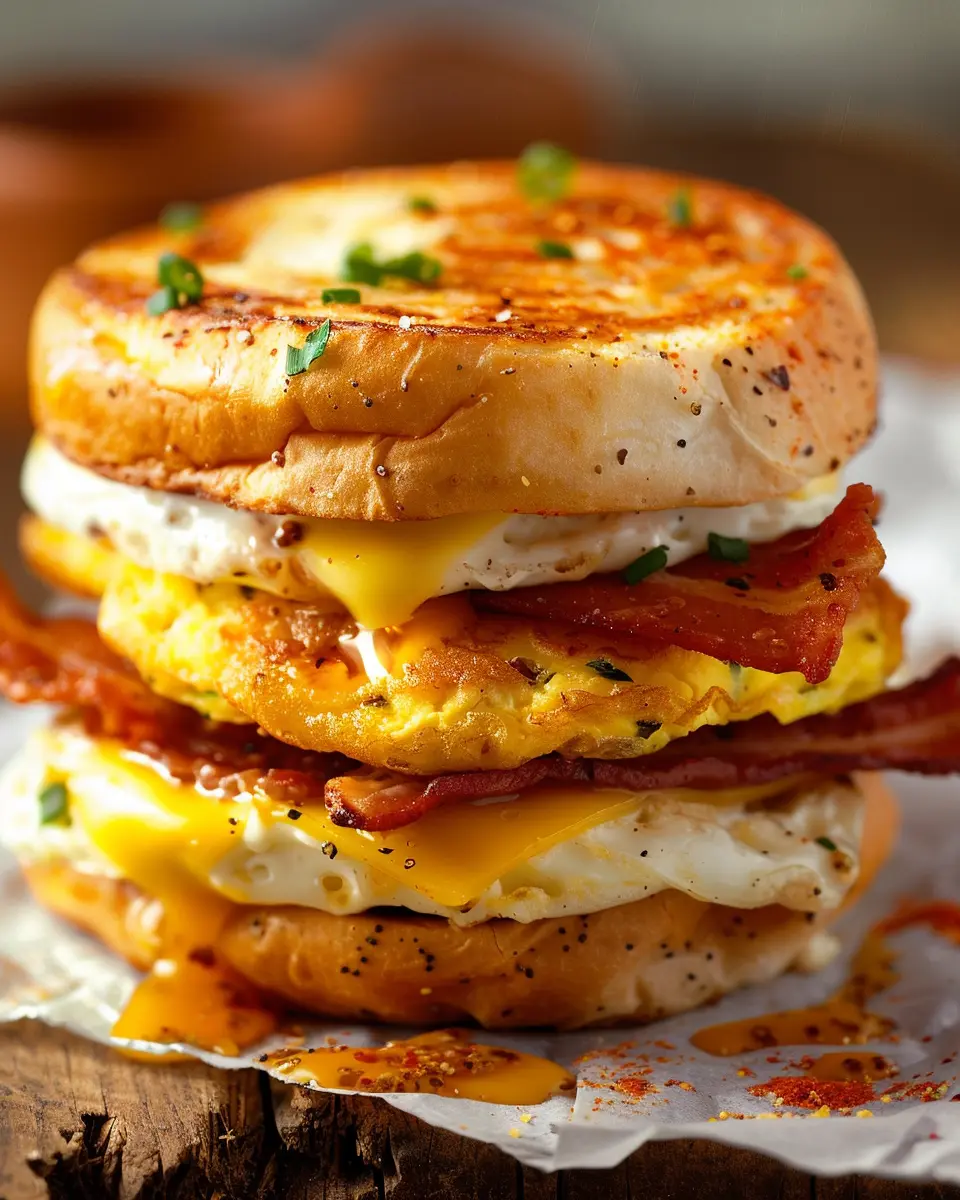 - Assemble the sandwiches by placing cheese, eggs, and bacon on each muffin half.