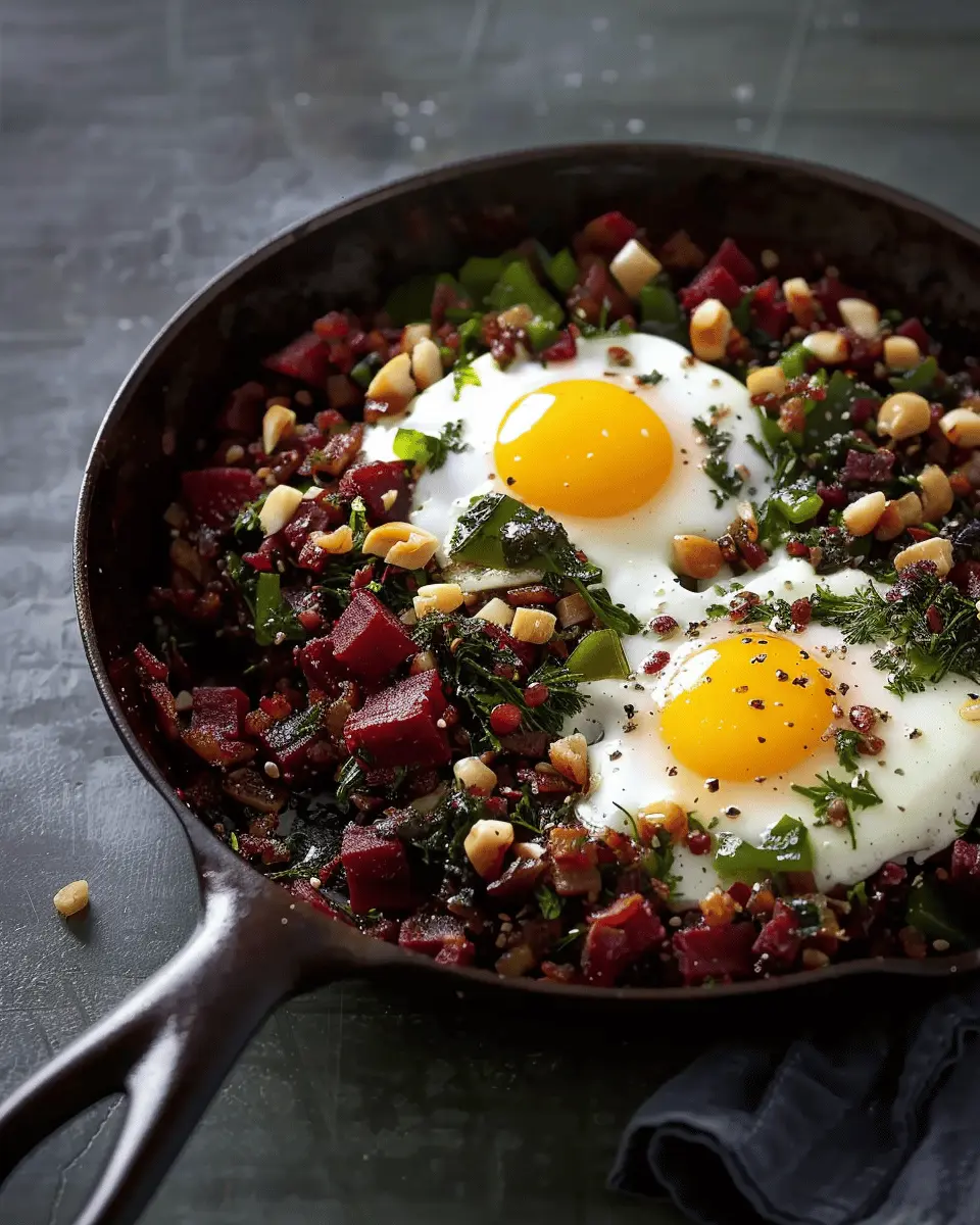 • Layering: Pile up the beet hash in the center, and gently place the fried or poached eggs on top, letting the yolks cascade down for a beautiful effect.