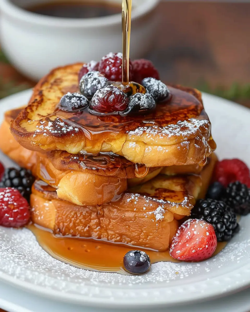 Start your mornings on a sweet note with berry-topped brioche French toast. Top fluffy slices of brioche with a vibrant mix of seasonal berries like strawberries, blueberries, and raspberries.