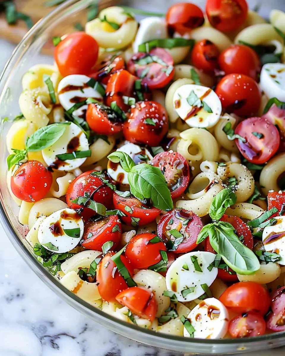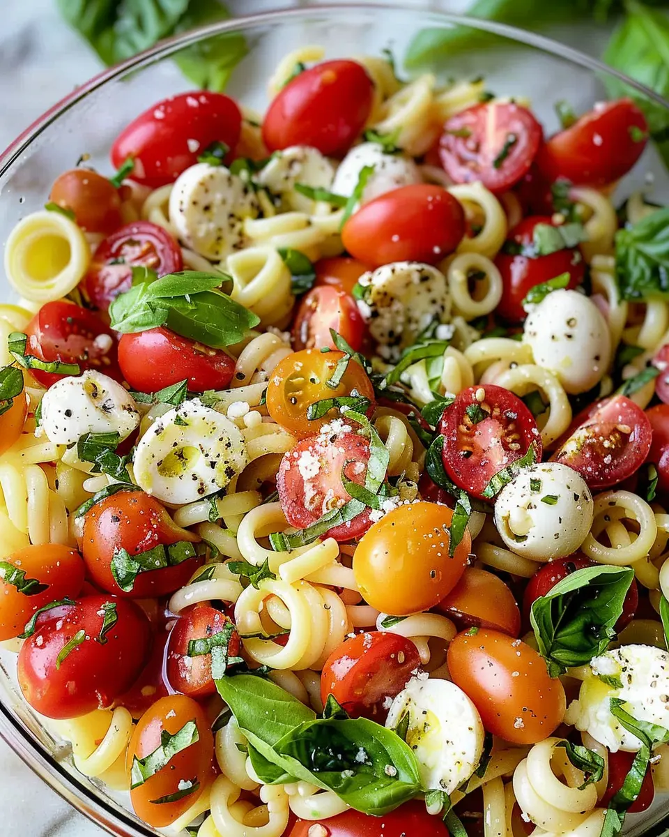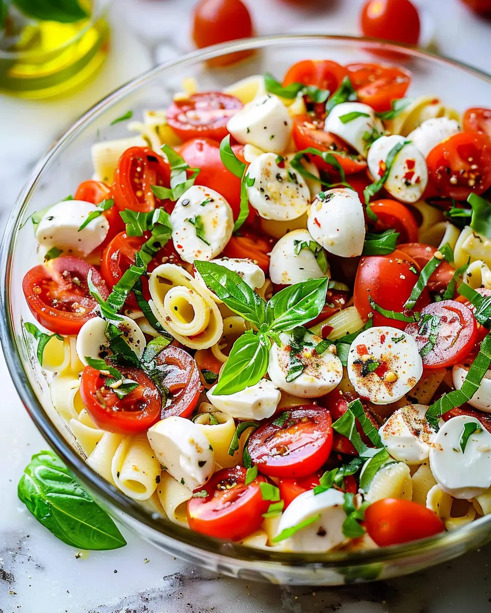 Enjoy the delightful combination of fresh tomatoes, mozzarella, and basil in this easy Caprese pasta salad.