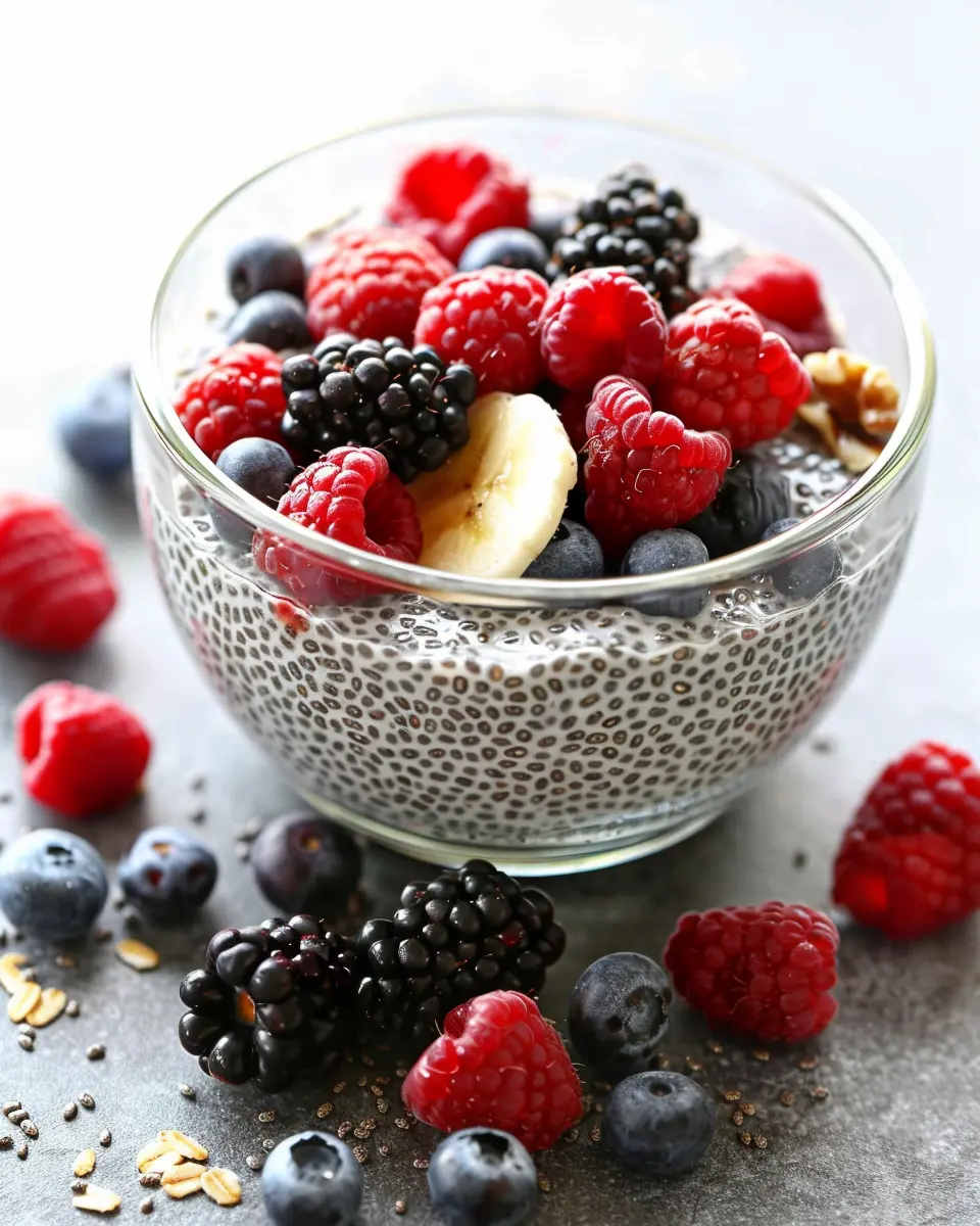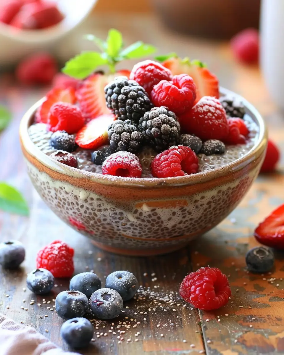 A delicious and nutritious chia seed pudding recipe topped with fresh berries, perfect for a healthy breakfast or snack.
