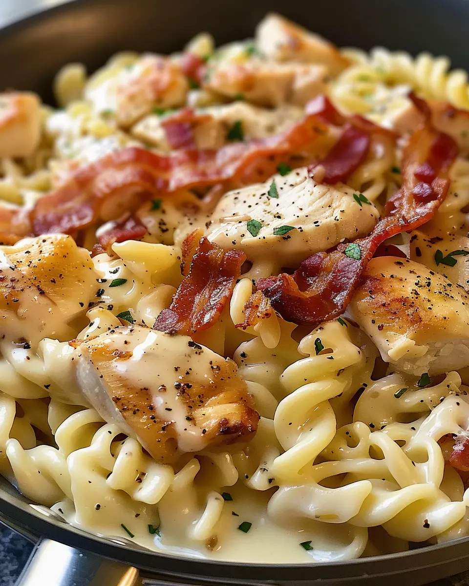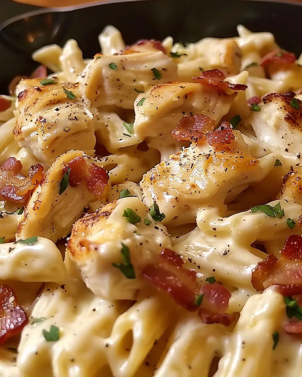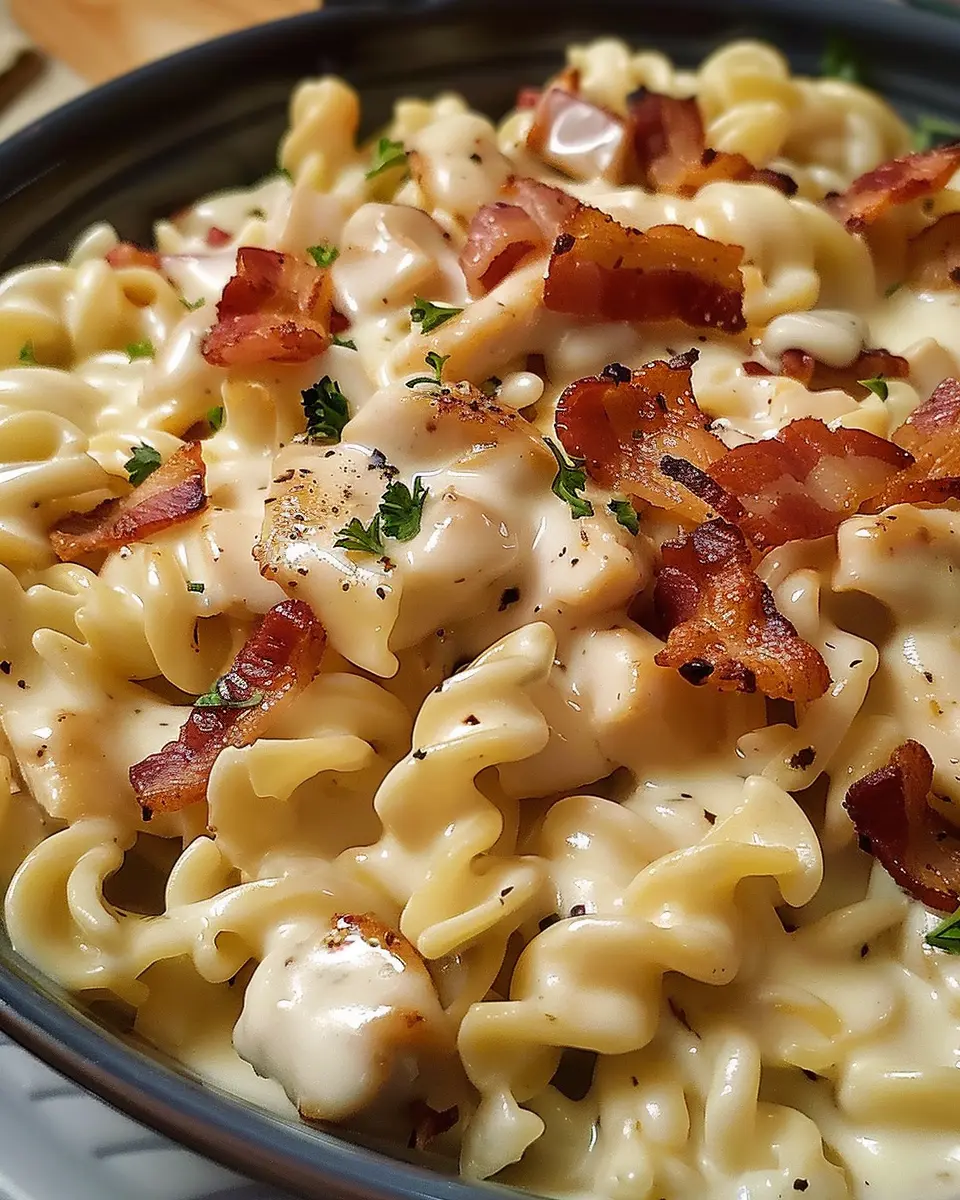 A deliciously easy weeknight meal that combines chicken, bacon, and ranch flavors in a comforting pasta dish.