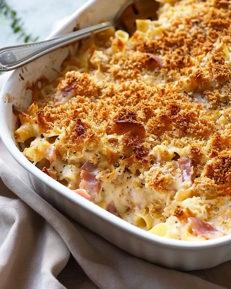 Preheat your oven to 350°F (175°C). In a large casserole dish, layer half of the cooked noodles at the bottom. Then, evenly distribute the shredded chicken, diced chicken ham, and crumbled turkey bacon over the noodles. This layering technique helps each bite burst with flavor.