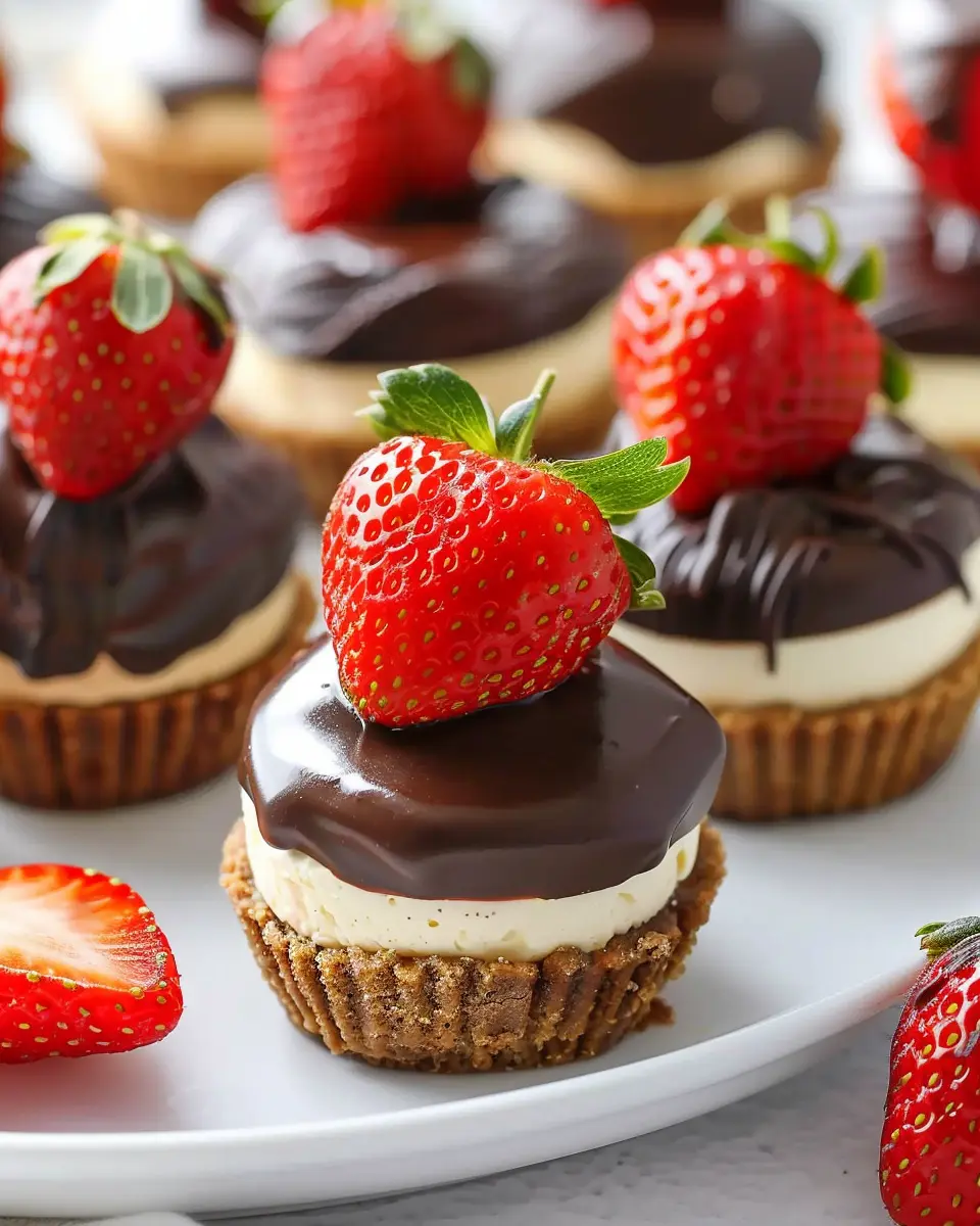 Delicious and cute mini cheesecakes topped with chocolate and fresh strawberries, perfect for any occasion.