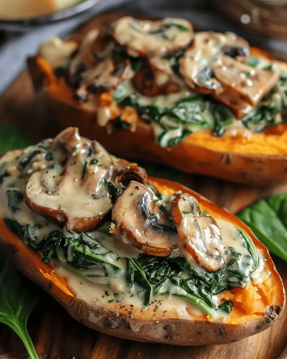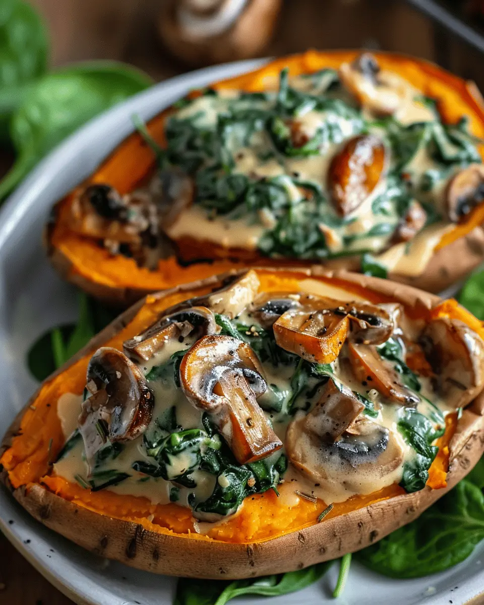 Creamy Mushroom and Spinach Stuffed Sweet Potatoes Delight