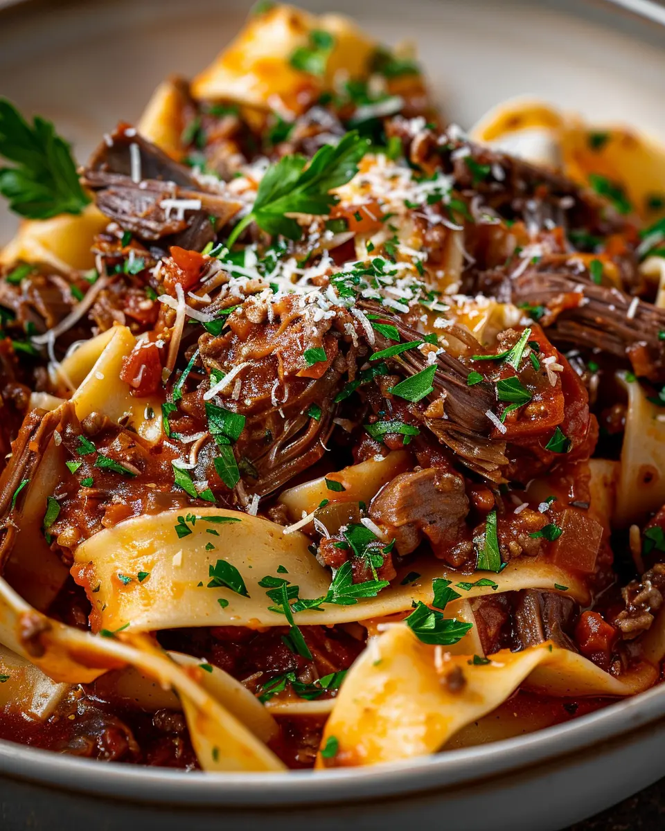 - Cook the pappardelle pasta according to package instructions; drain and combine with the ragu.