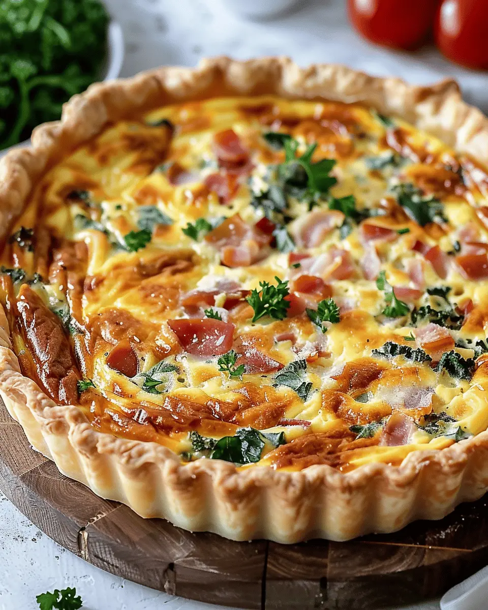 A delicious and easy breakfast quiche recipe featuring turkey bacon and chicken ham, perfect for a hearty morning meal.