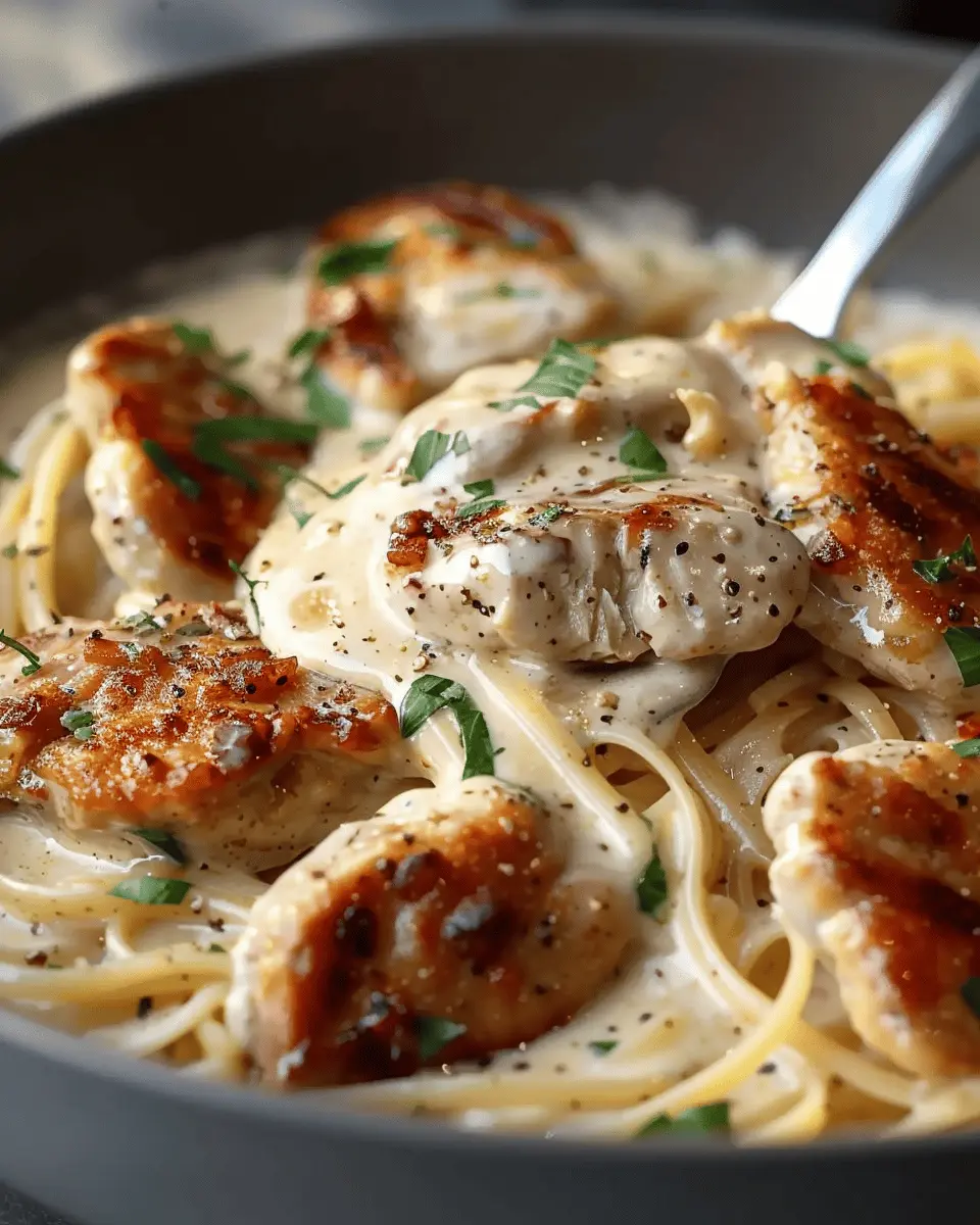 Once your sauce is ready, it’s time to bring everything together. Add the drained pasta into the skillet and toss to coat it in that luscious sauce. If you wish, add your seared chicken or turkey bacon back into the mix.