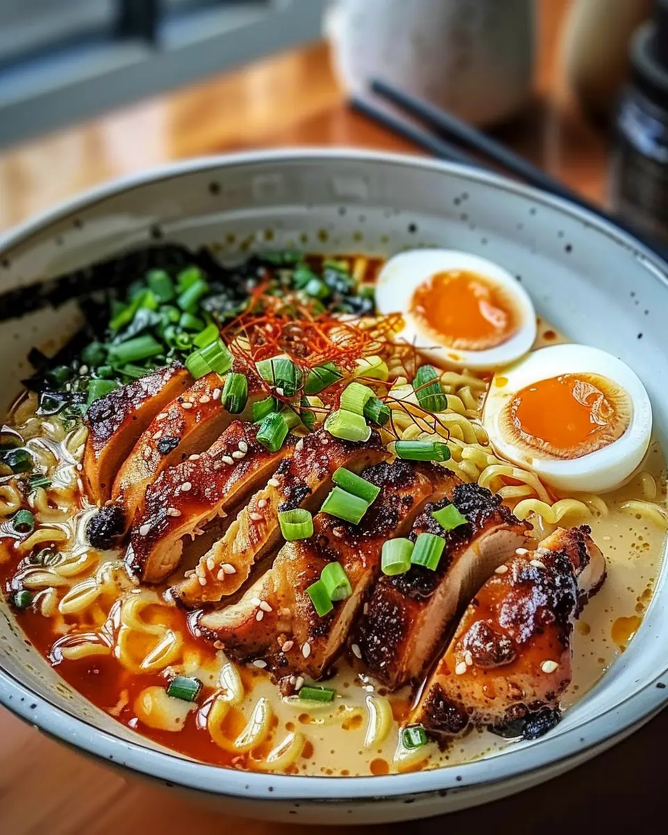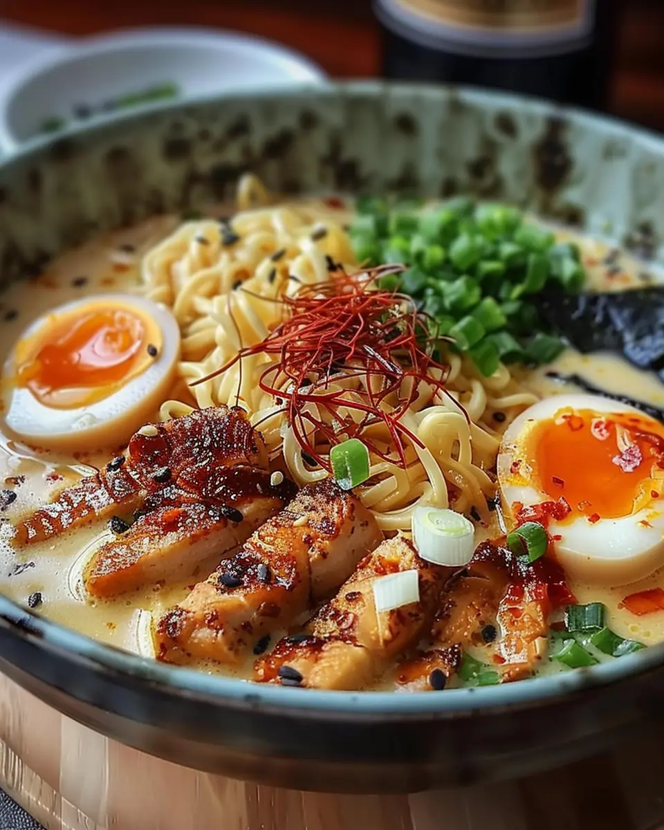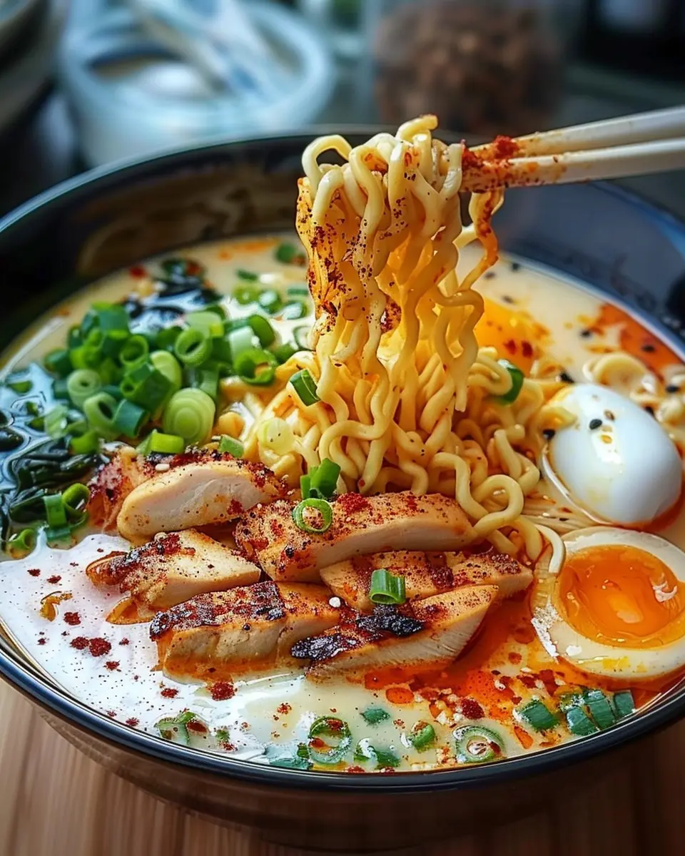 Keywords: Fiery Chicken Ramen, Creamy Garlic Sauce, Ramen Recipe, Spicy Noodles