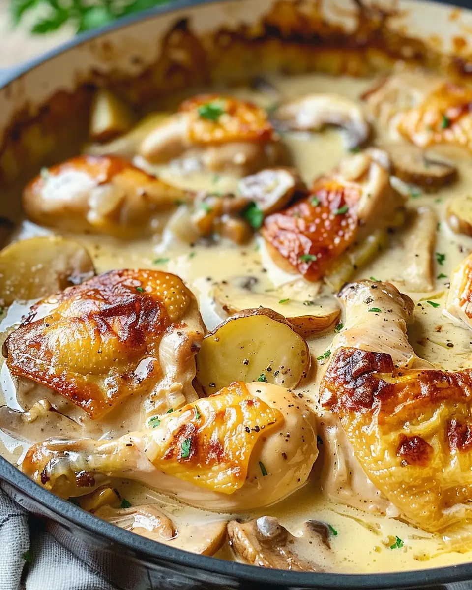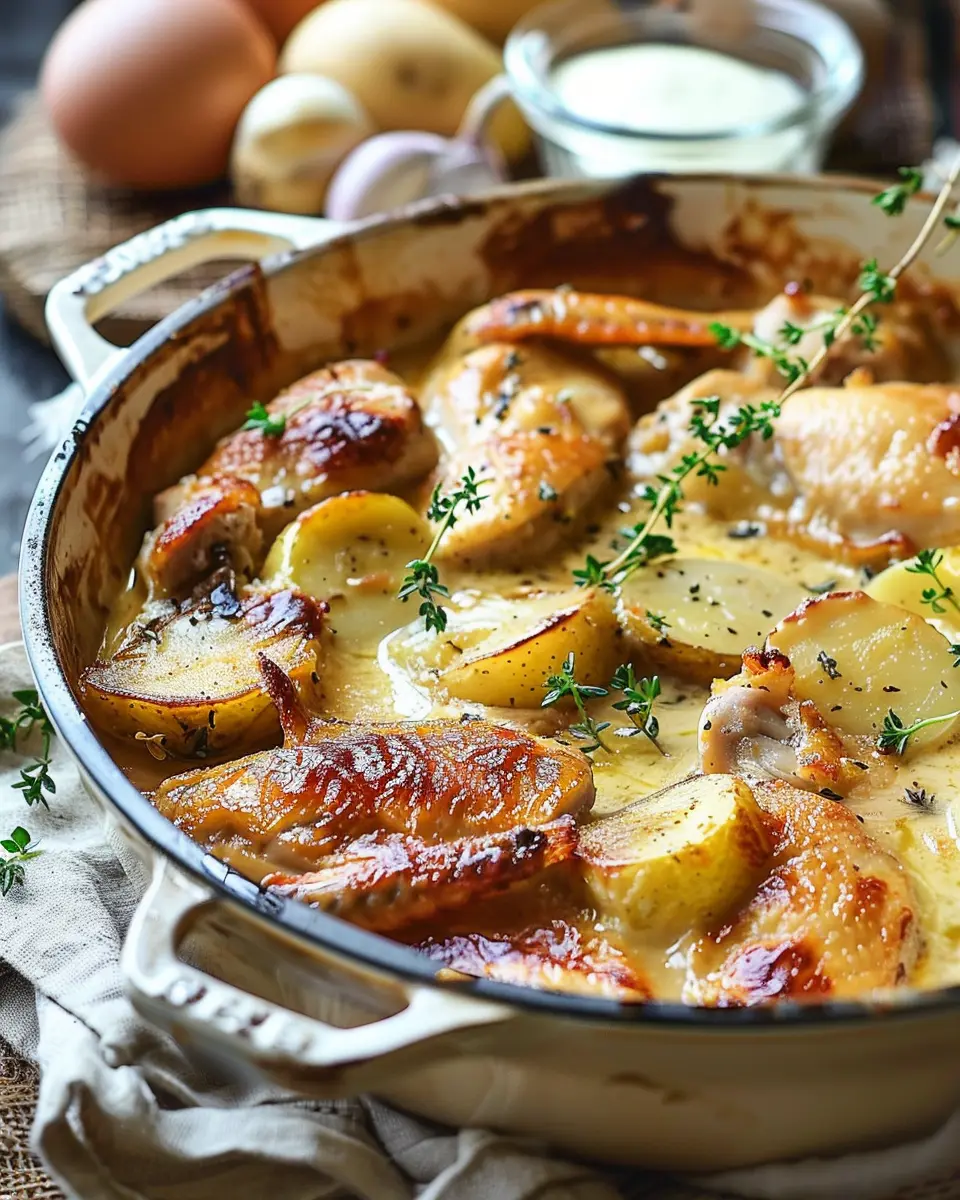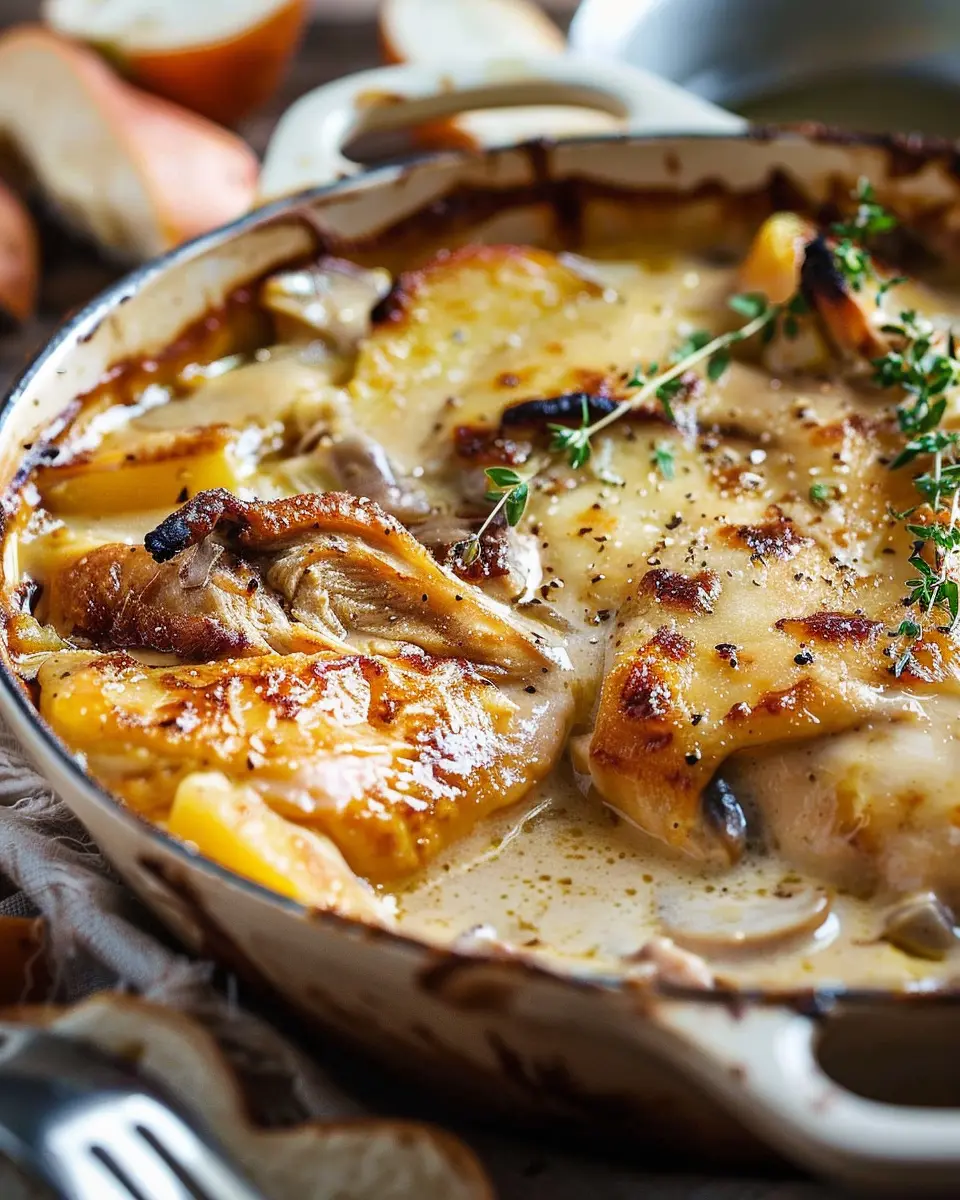 A delicious and comforting chicken casserole with a French twist, featuring creamy sauce and fresh ingredients.
