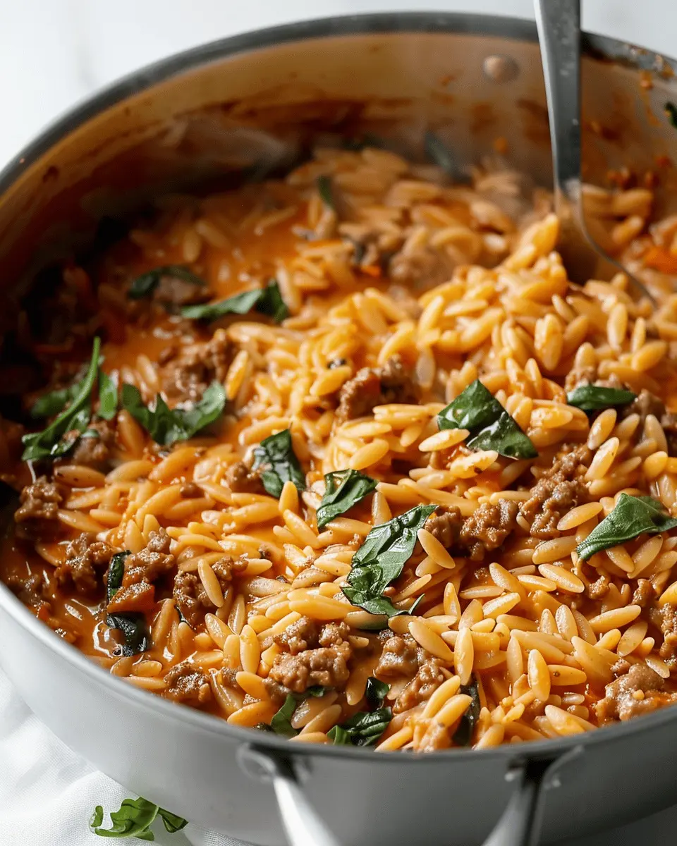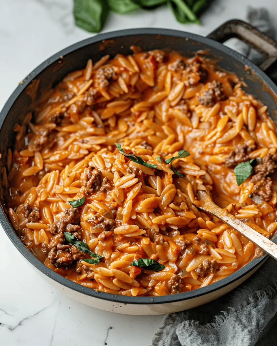 Keywords: Hearty Ground Beef Orzo, Tomato Cream Sauce, Easy Recipe