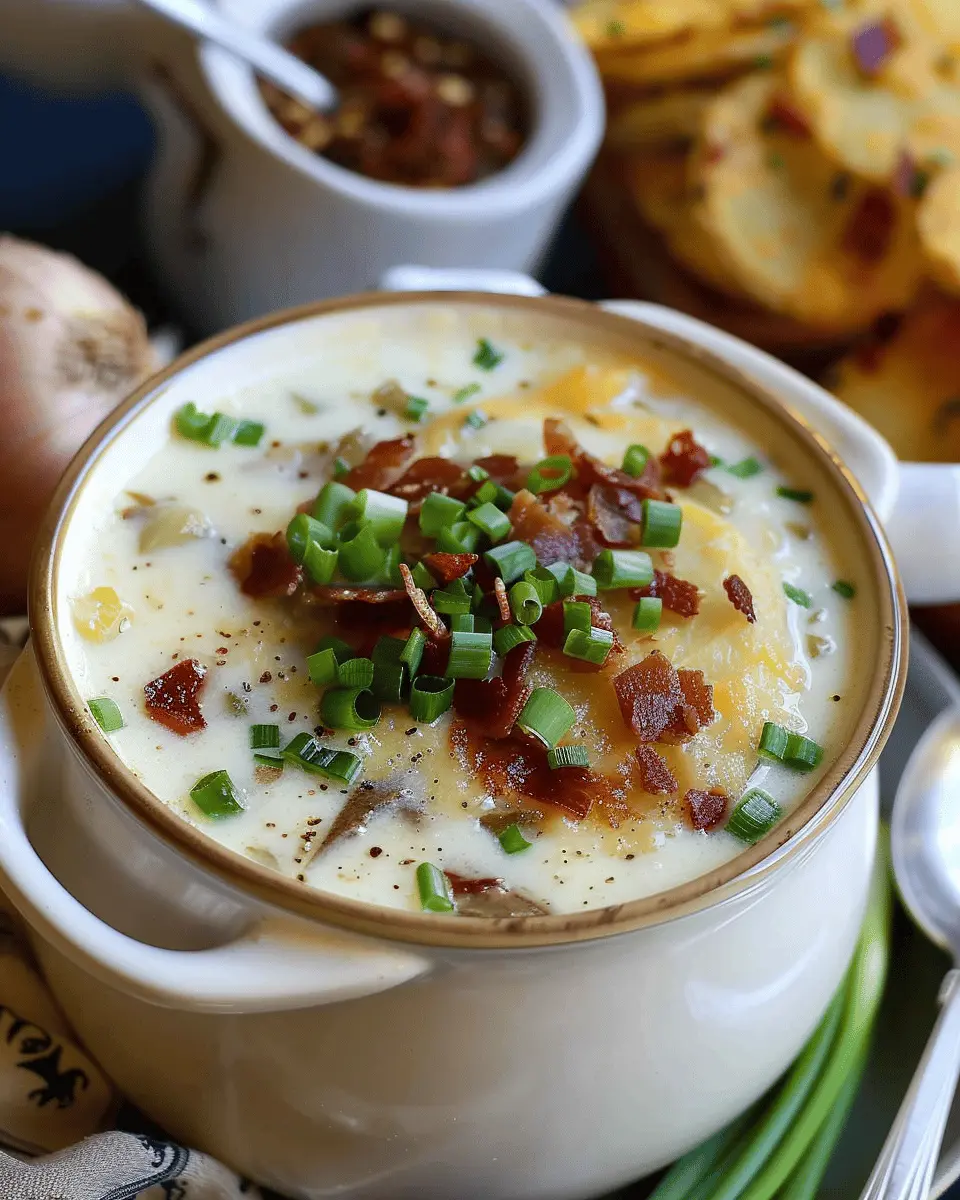 A rich and creamy loaded baked potato soup enhanced with turkey bacon for a delightful twist.
