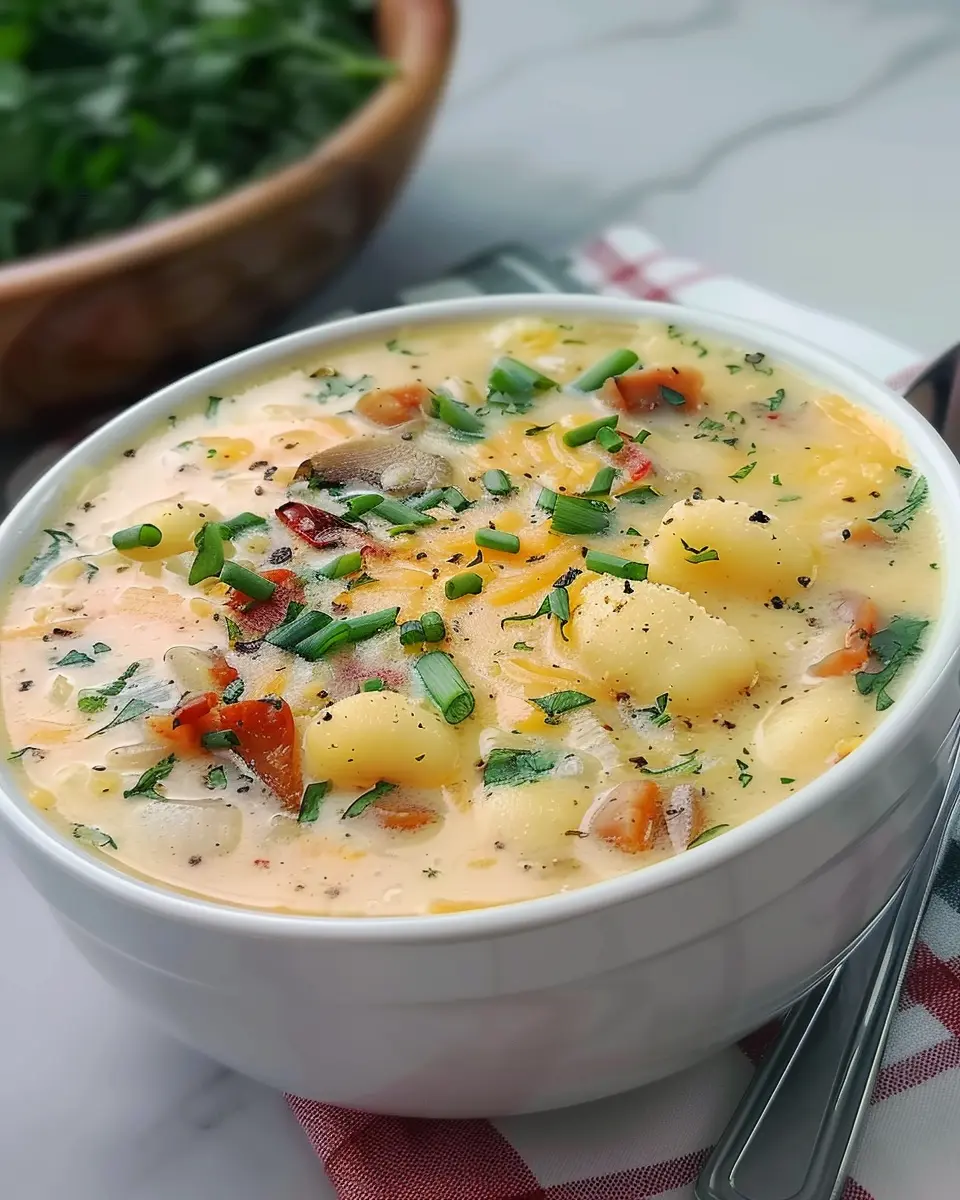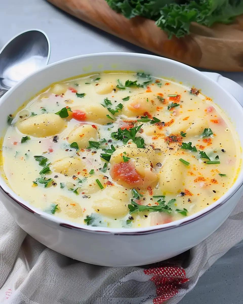 A creamy and flavorful soup packed with gnocchi, turkey bacon, and chicken ham, perfect for chilly days.
