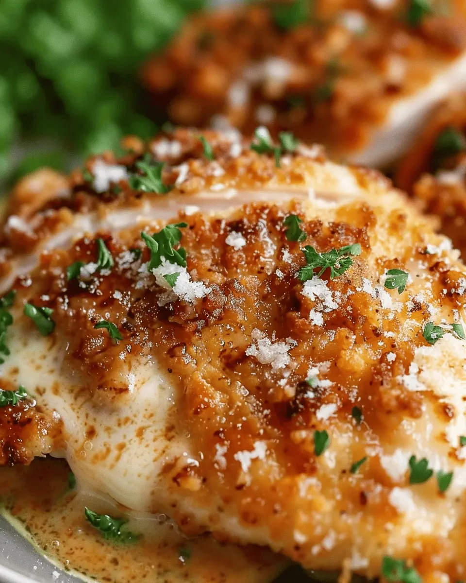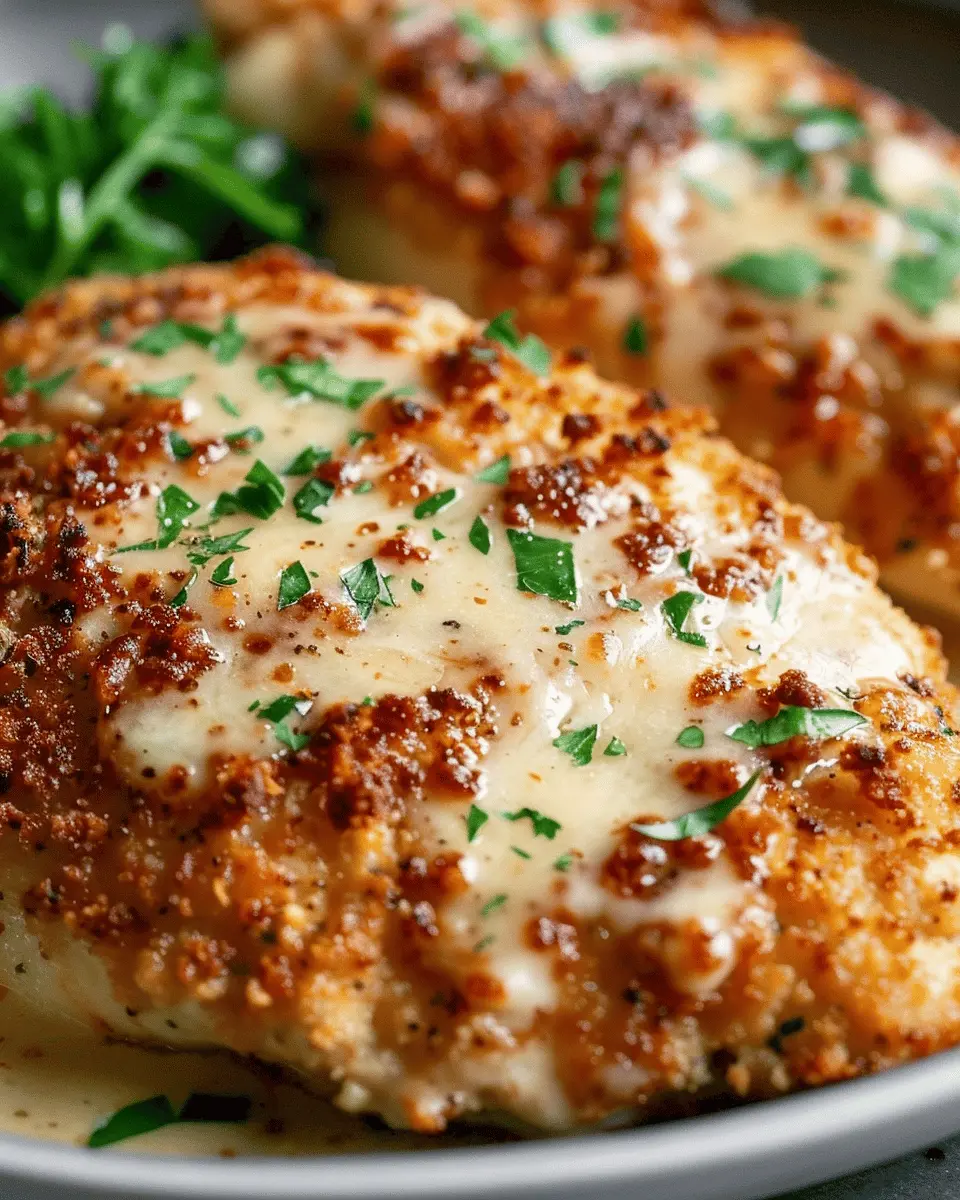 Once your chicken is perfectly baked, remove it from the oven and drizzle the creamy garlic sauce generously over each piece before plating. A sprinkle of fresh parsley adds a vibrant touch while balancing the richness of the dish. Serve alongside a fresh salad or roasted vegetables for a complete meal that feels just as satisfying as a night out.