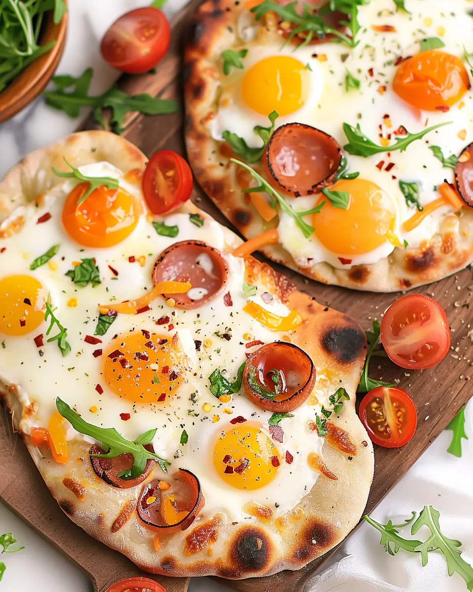 It wouldn’t be a breakfast pizza without eggs! Crack one or two eggs right in the center of each naan pizza. You have the flexibility to leave the yolk whole for a runny, creamy effect, or scramble them first if you prefer. Make sure to season the eggs with a dash of salt and pepper to bring out the flavors.