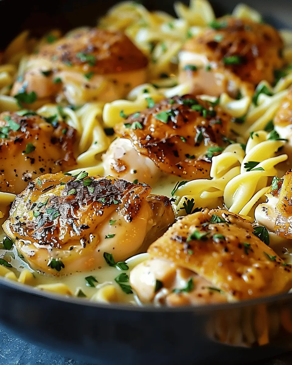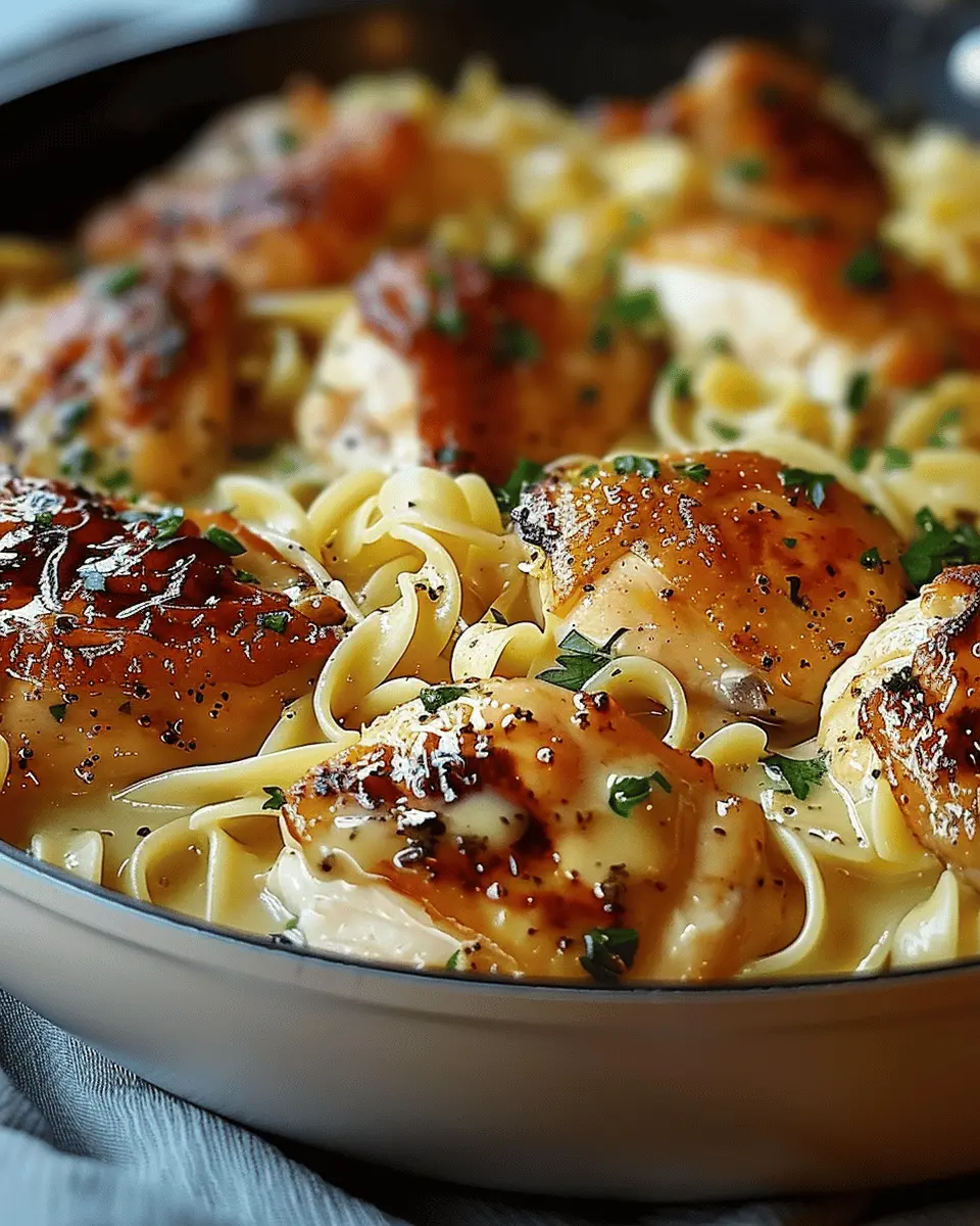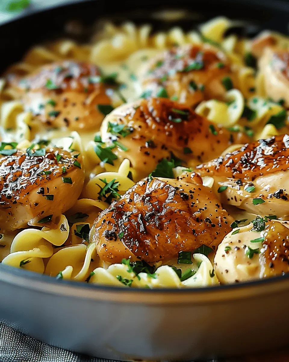 Finally, once the noodles are cooked, return the seared chicken to the skillet. Add a generous pat of butter, allowing it to melt and coat everything in silky richness. If you want to elevate the flavor, toss in freshly chopped herbs – they brighten up the dish like nothing else!
