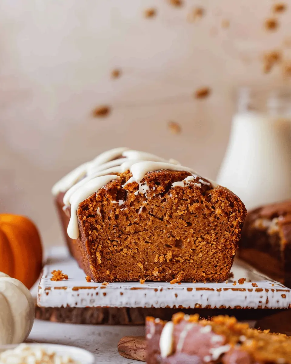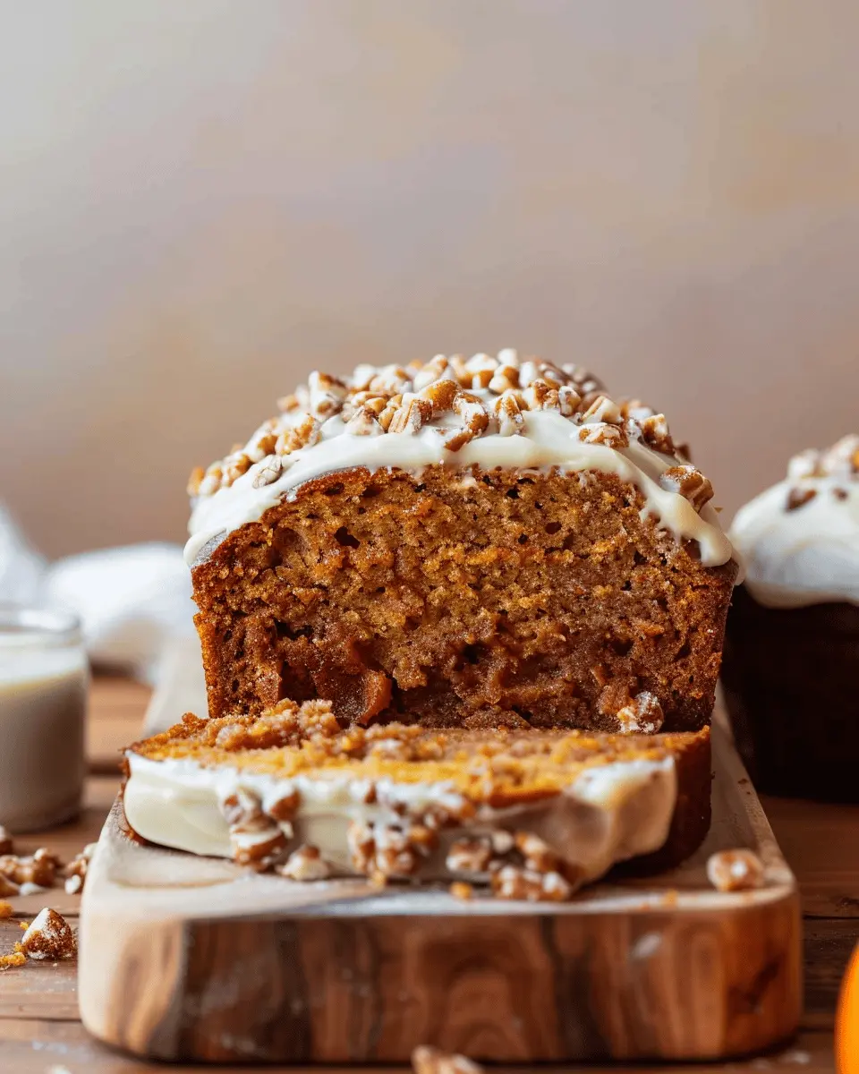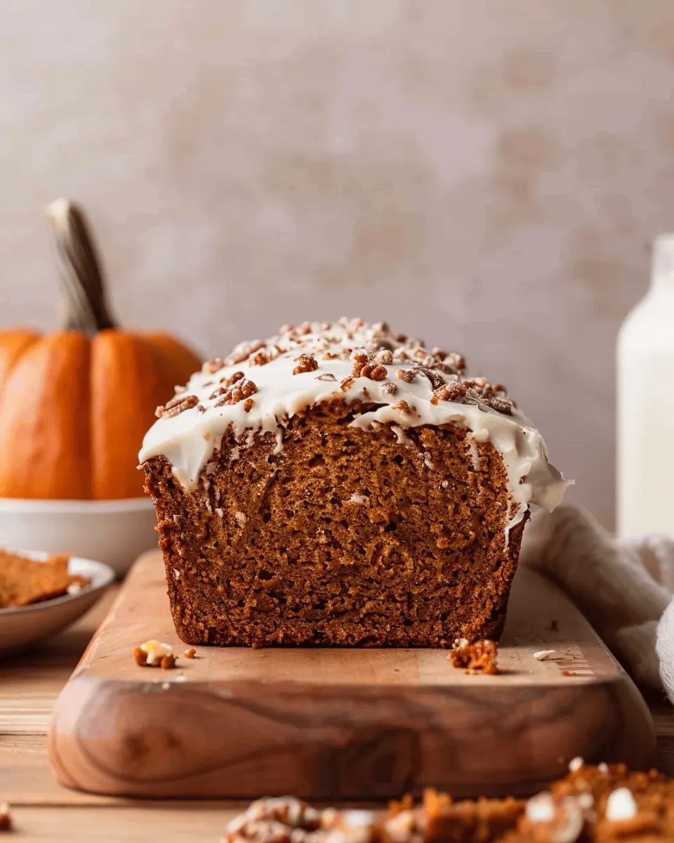 Pumpkin bread is a delightful fall treat that pairs perfectly with creamy frosting.