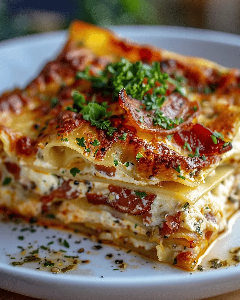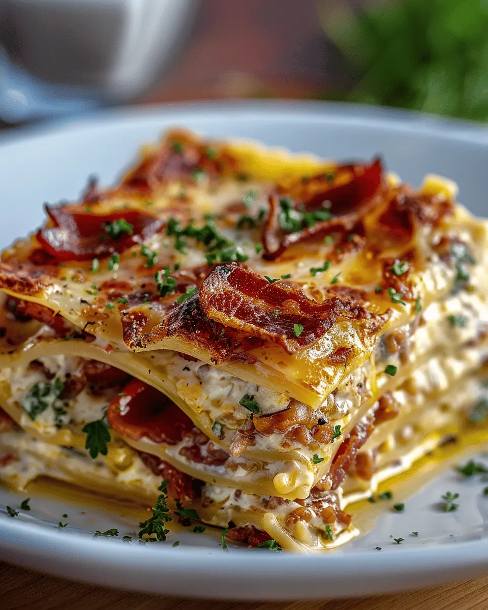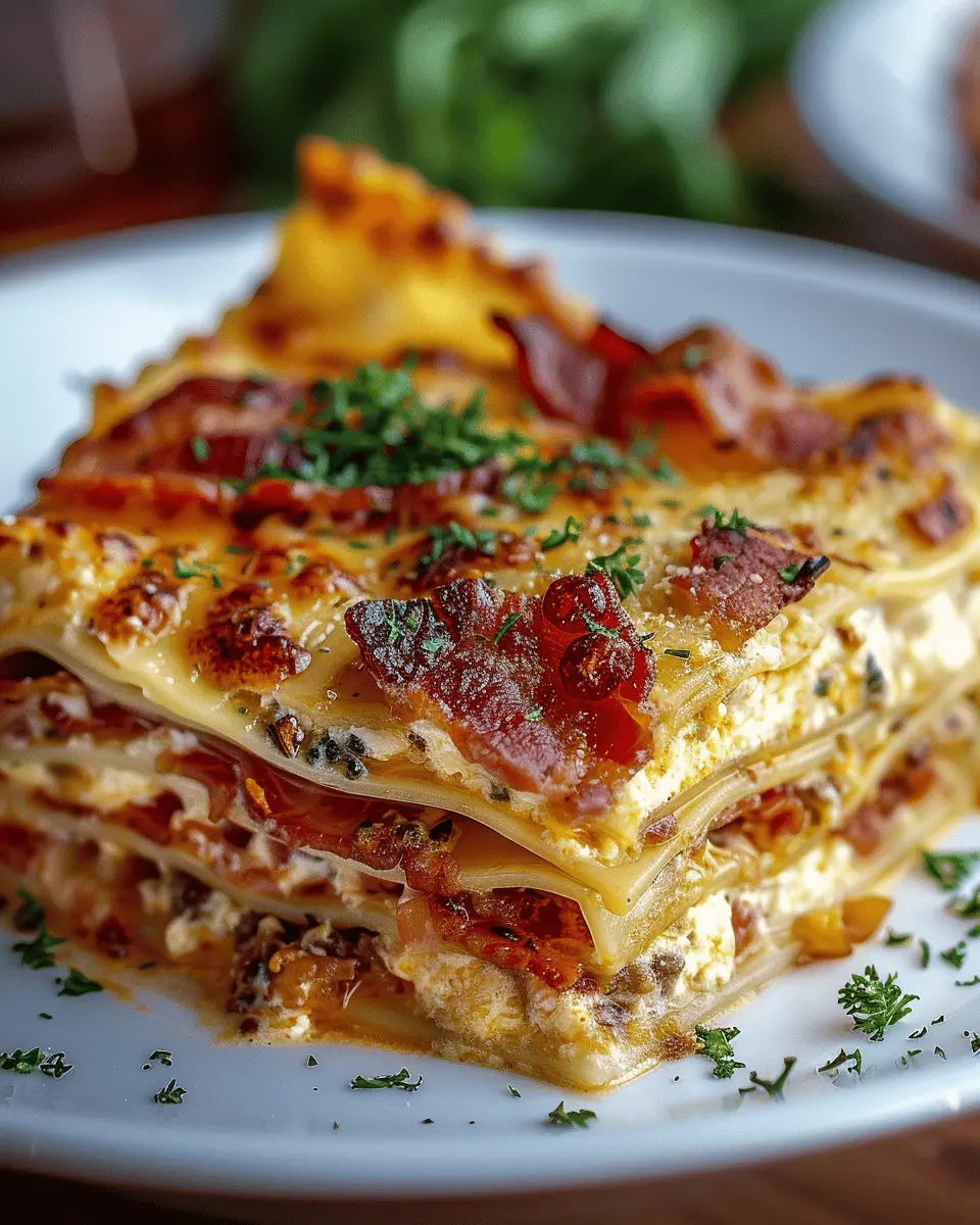 A delicious and quick lasagna made with turkey bacon and a garlic parmesan sauce.