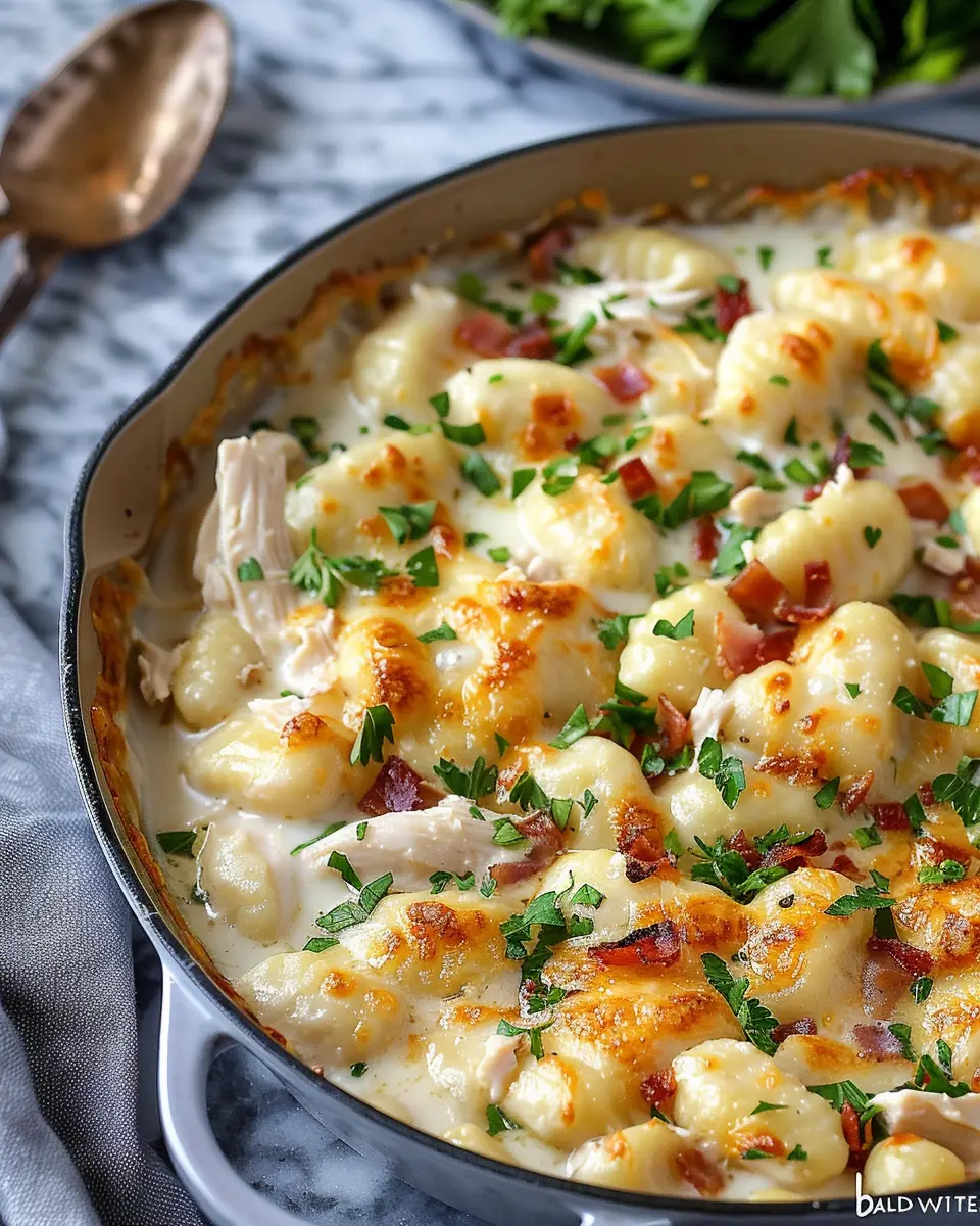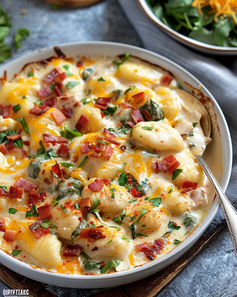 - Mix everything: In a large baking dish, combine the shredded chicken, crispy turkey bacon, cooked gnocchi, and creamy sauce. Gently fold everything to coat well.