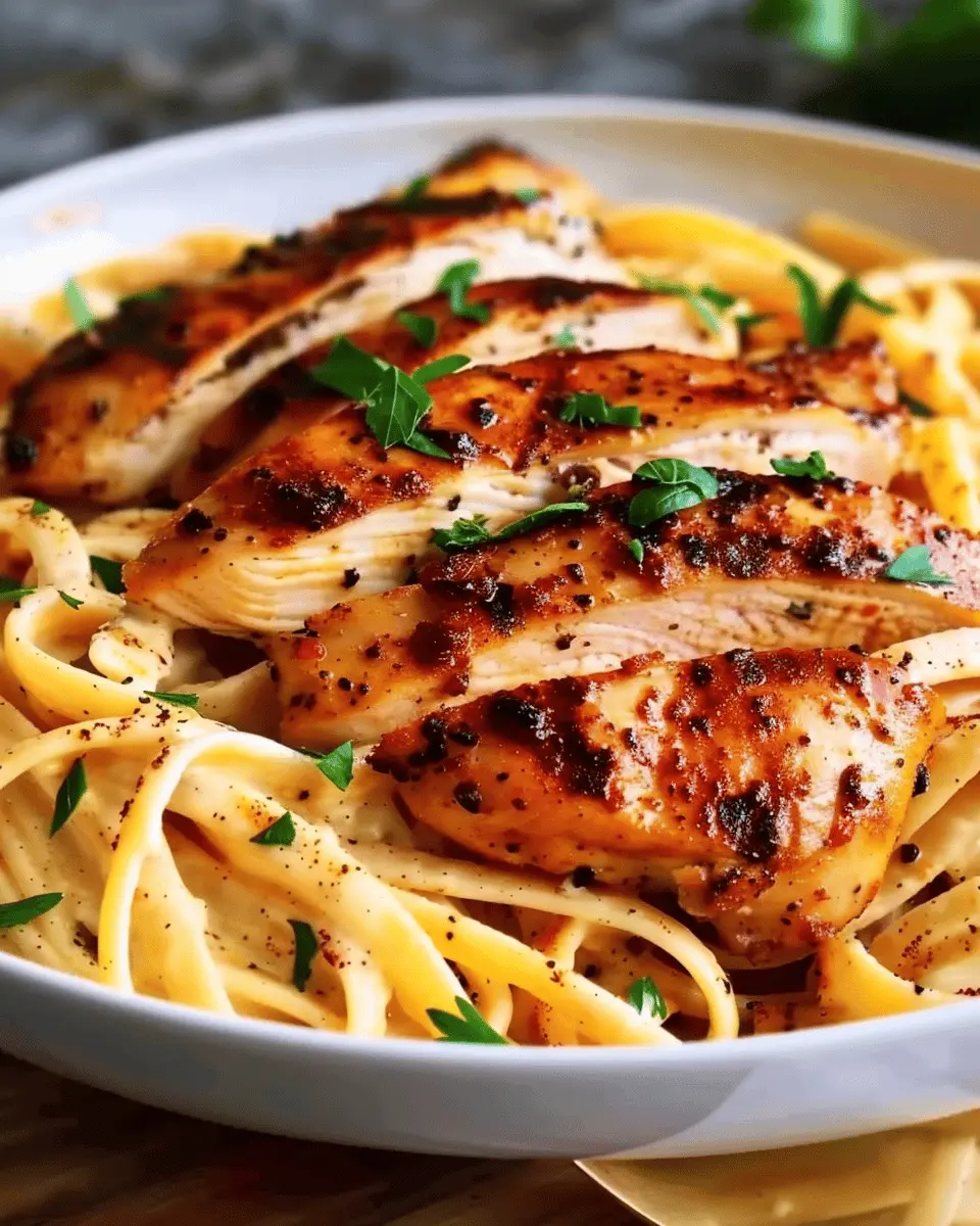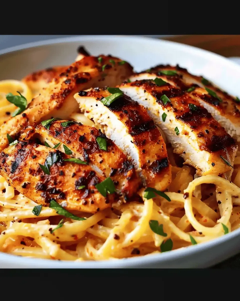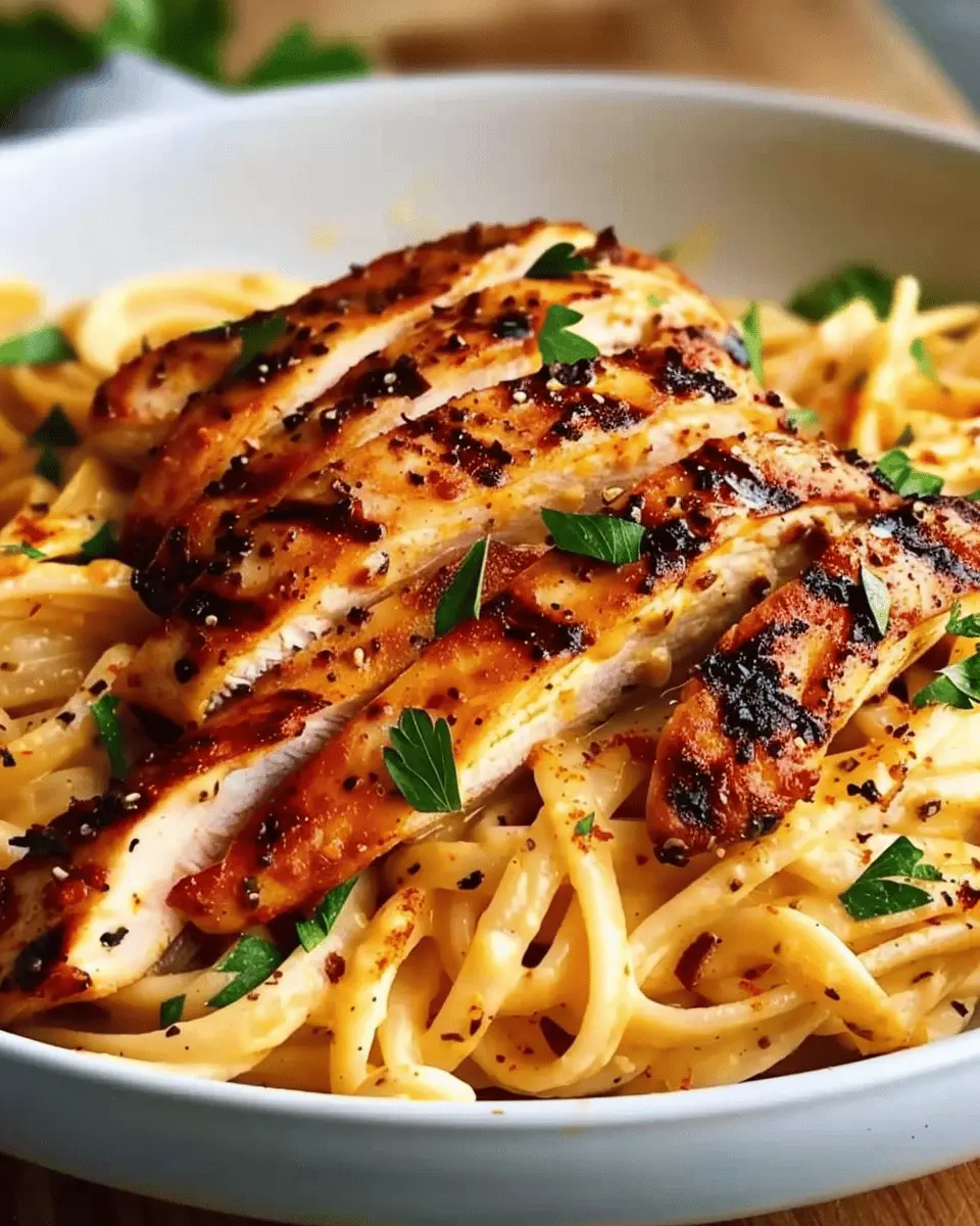 A deliciously spiced Cajun chicken served over creamy parmesan linguine, perfect for a delightful meal.