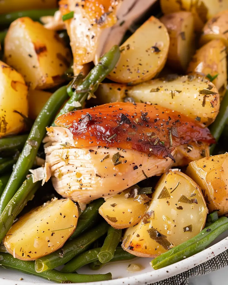 - Ingredients: Chicken breasts, baby potatoes, fresh lemon juice, minced garlic, rosemary, thyme, olive oil, salt, and pepper.