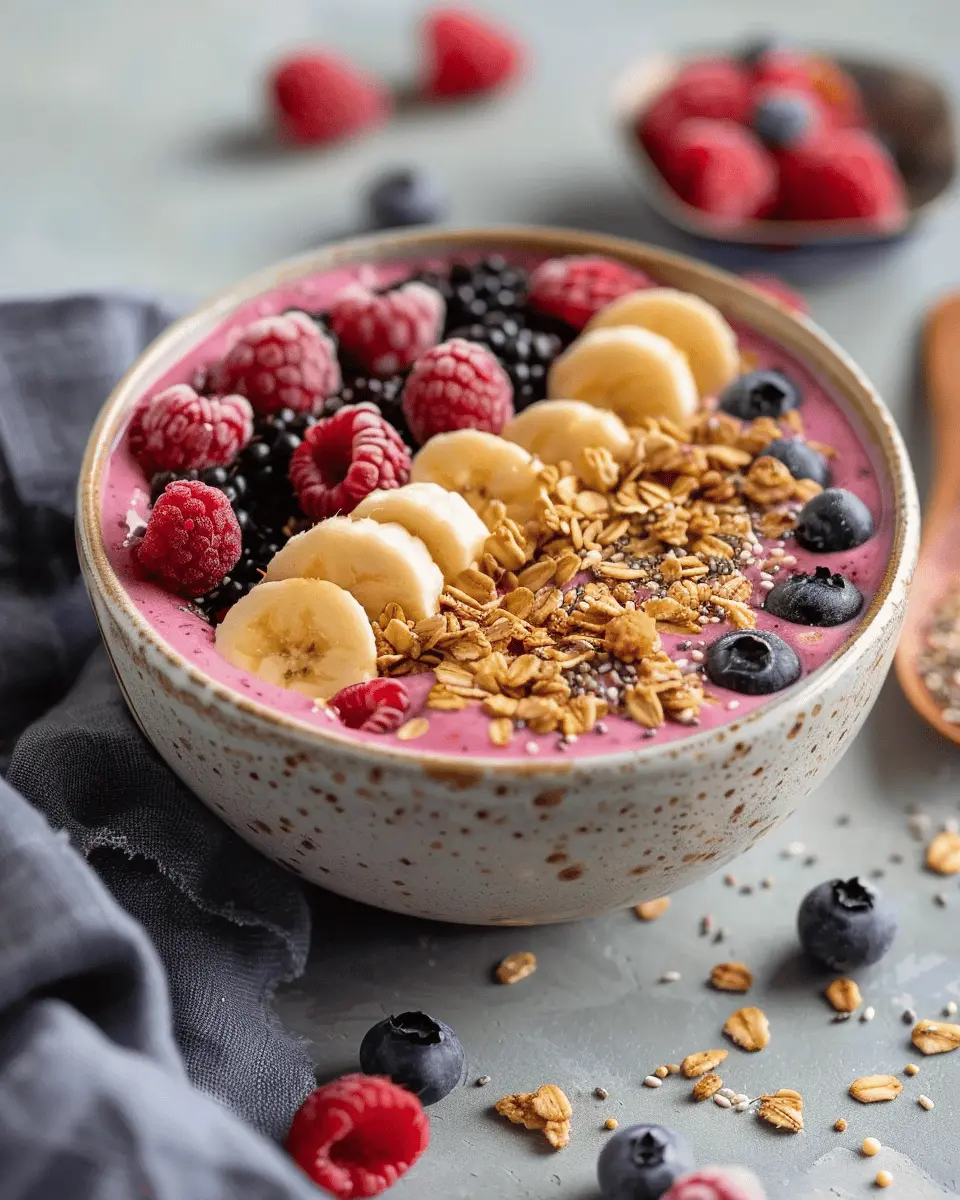 Packed with antioxidants, vitamins C and K, and dietary fiber, this bowl helps support your immune system and digestion. The berries provide natural sweetness while keeping the nutrient profile high.