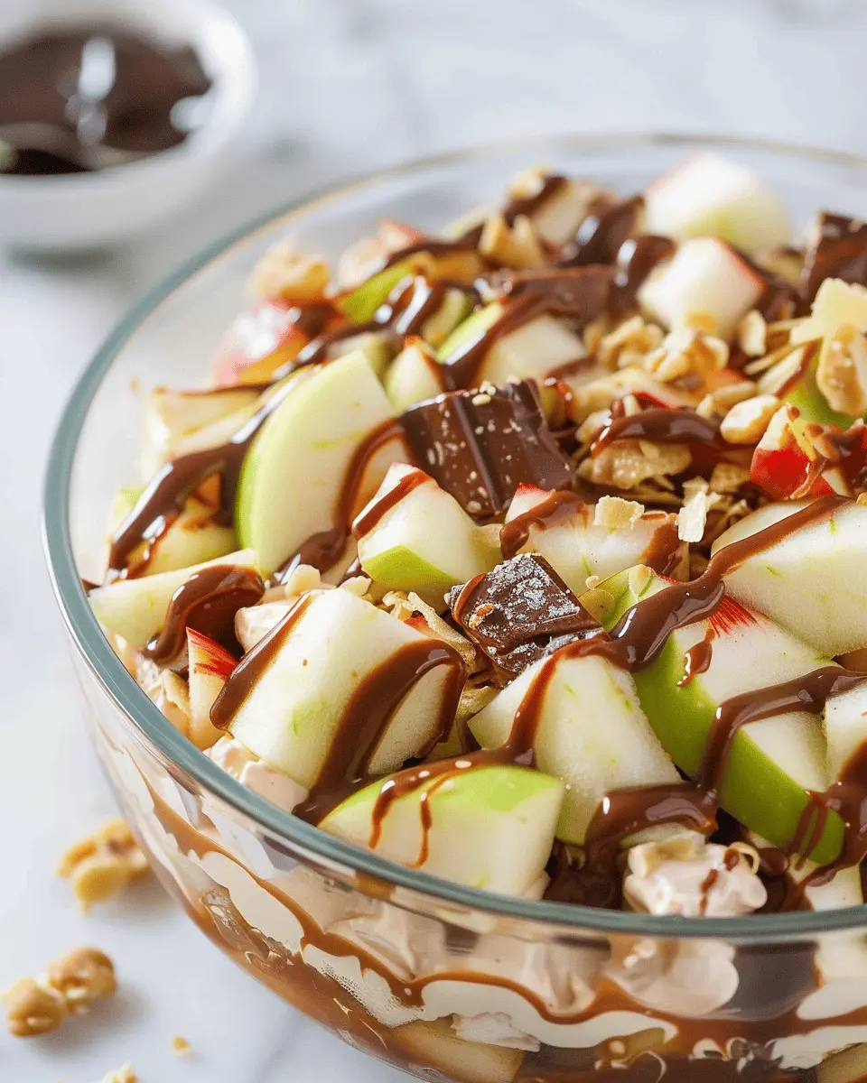 For chocolate lovers, the Snickers Apple Salad can be transformed with a simple drizzle of chocolate. It not only enhances the visual appeal but elevates the overall flavor profile.