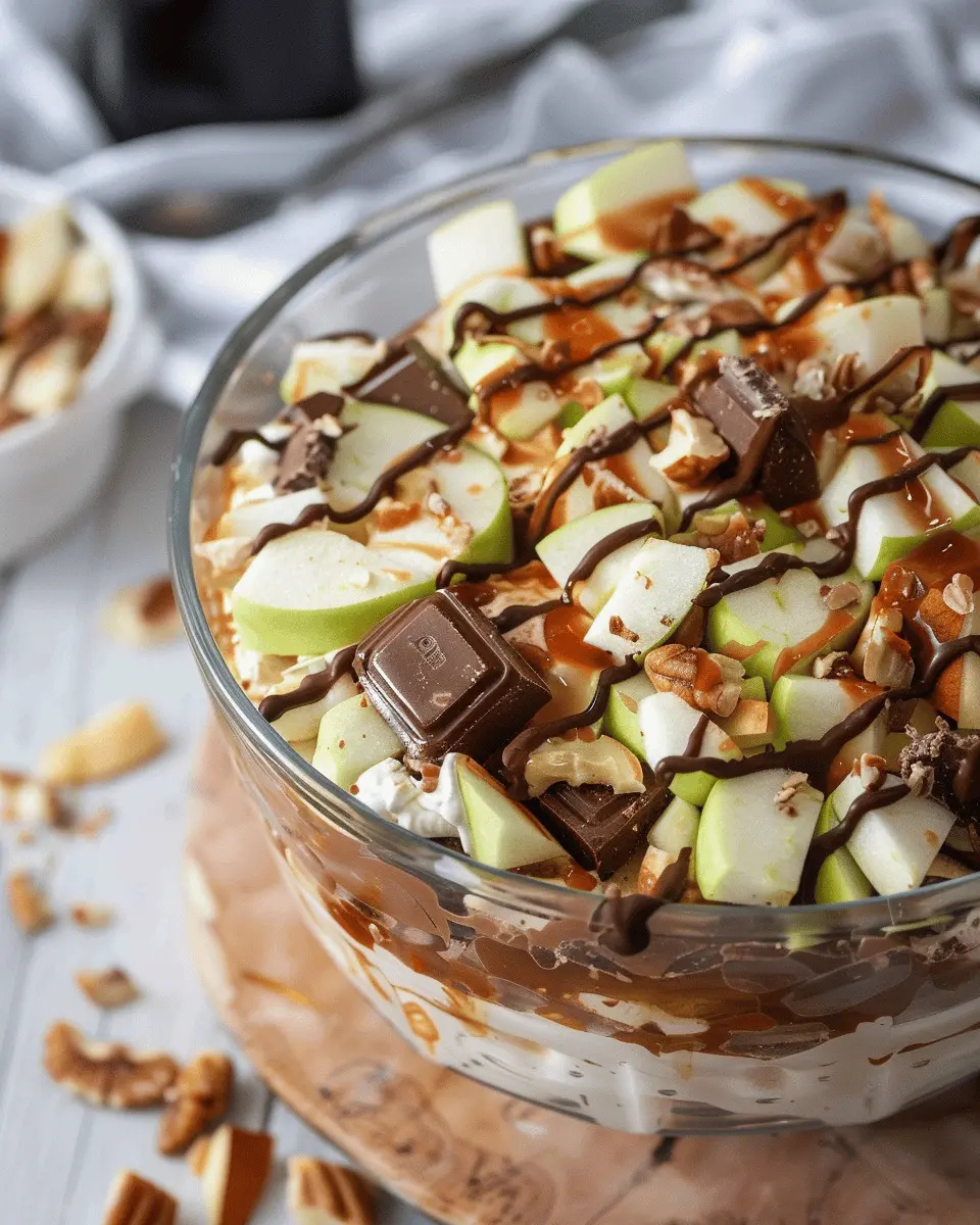 Imagine the warm hug of caramel blended into your Snickers Apple Salad. This version incorporates rich caramel sauce and crunchy pecans for an indulgent upgrade.