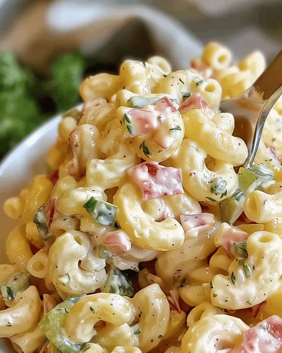 Keywords: Southern Macaroni Salad, Turkey Bacon, Chicken Ham, Pasta Salad