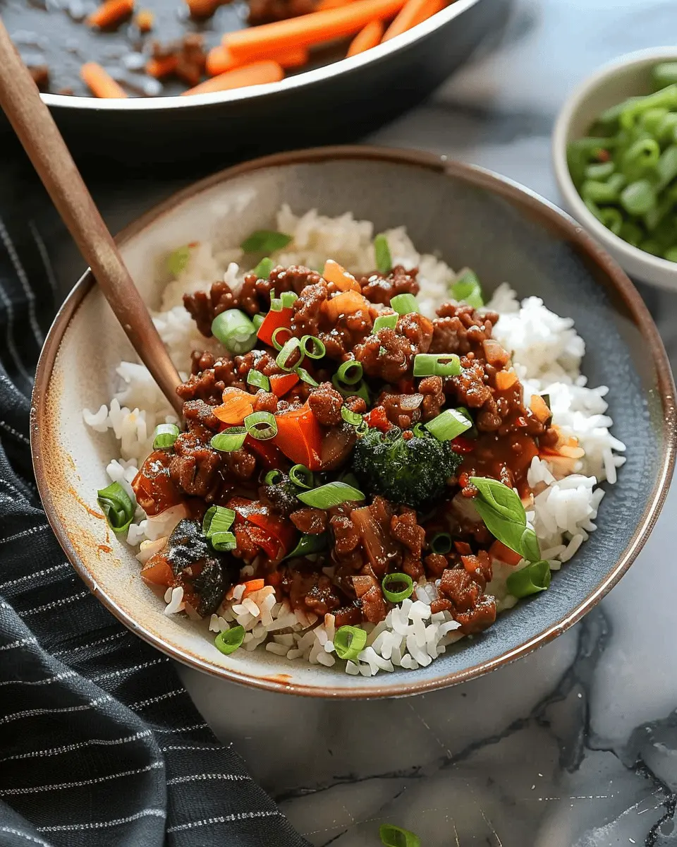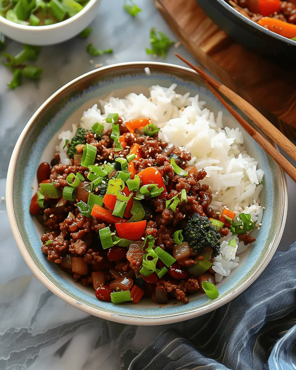 The beauty of a spicy ground beef stir-fry bowl lies in its versatility! Want to throw in some extra veggies like carrots or zucchini? Go for it! Not a beef fan? Try substituting with ground chicken or even tofu for a plant-based version. Don’t forget to add your favorite seasonings or garnishes—perhaps some sesame seeds or a squeeze of lime for a zing.