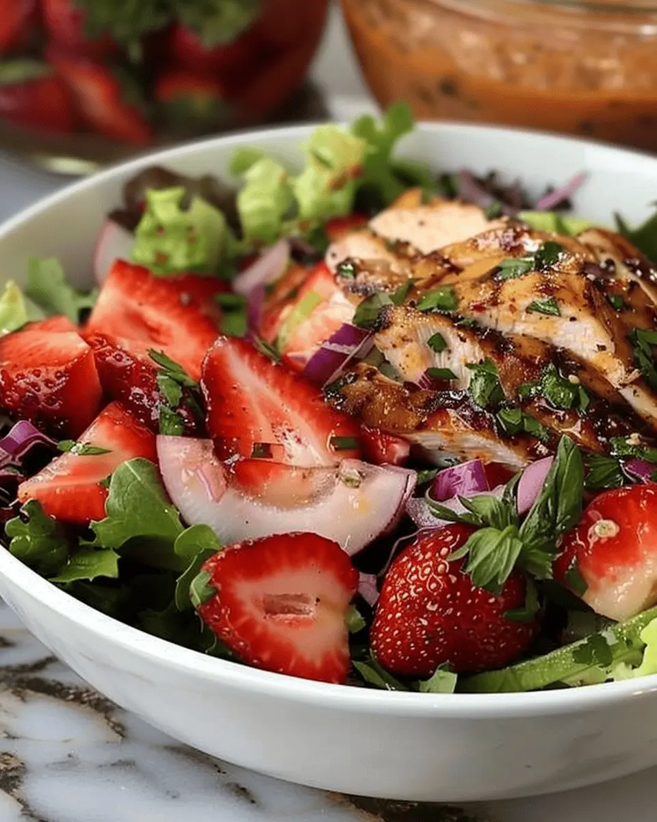 A refreshing salad that combines juicy strawberries with grilled chicken for a delightful meal.