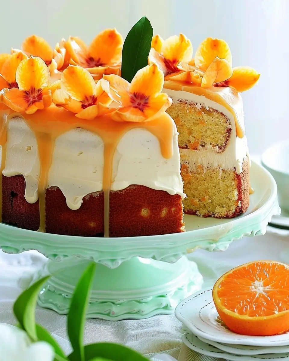 Once your cake has baked to perfection, remove it from the oven and invert it onto a wire rack to cool completely. This cooling method helps maintain that airy quality we’ve worked so hard for. After the cake is cool, drizzle the tangerine glaze over the top, allowing it to cascade down the sides.