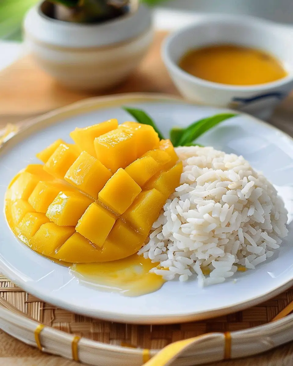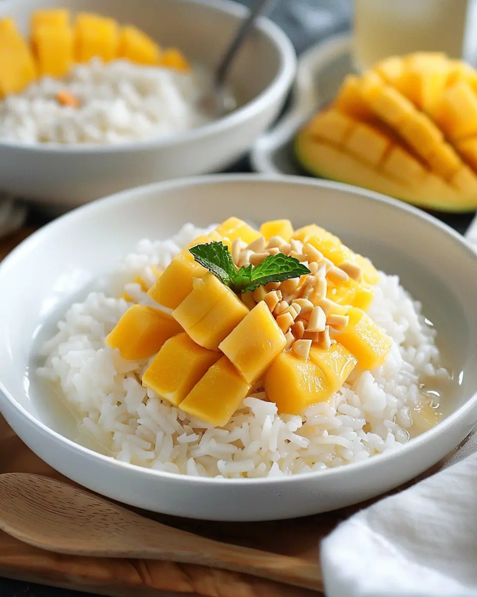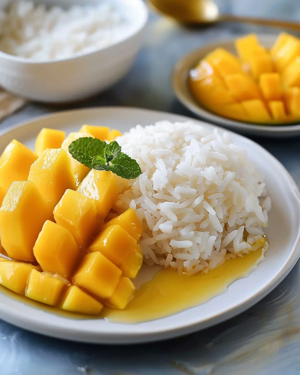 Elevate your Thai mango sweet sticky rice experience with stunning plating. Start by molding the sticky rice into small, neat cups, allowing you to showcase the vibrant mango slices on top. Drizzle a touch of coconut sauce for a glossy finish and add a sprinkle of sesame seeds or toasted coconut for texture. You can also layer the rice and mango for a beautiful, colorful dessert. Serving it in a banana leaf or on a wooden platter gives it a rustic feel that can impress your guests and add a touch of authenticity.